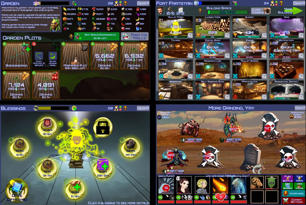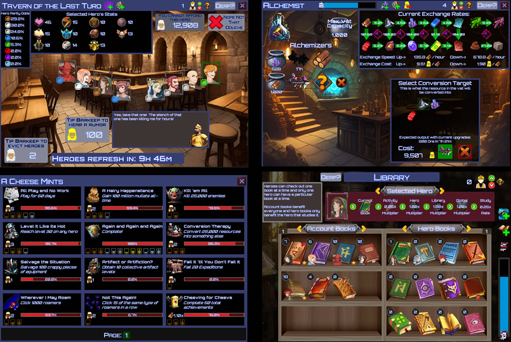 Seems like it has been both much longer and much less time than the 18 months it has been since I last posted on this website. The game is very much alive and has had several releases that have made it much better in the interim. The collage below shows some of the more recent improvements, but there have been far, far too many to list. I just released a new build today that includes achievements! I am still having tons of fun doing this and plan to keep going for quite a while.